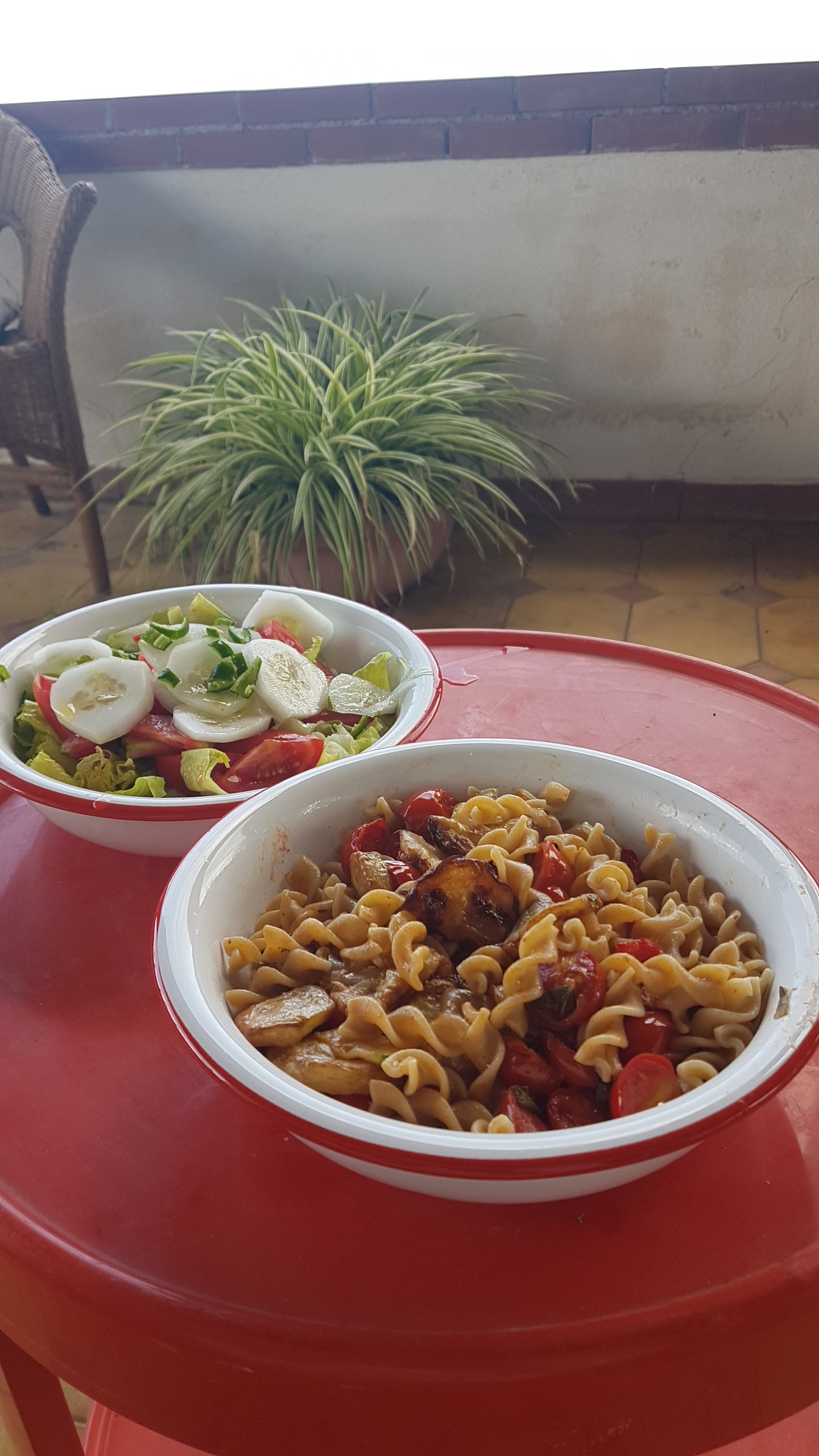 From the organic field: two potatoes, half a chilo of green beans, olive oil and garlic. In microwave. Just add soya souce from the market.