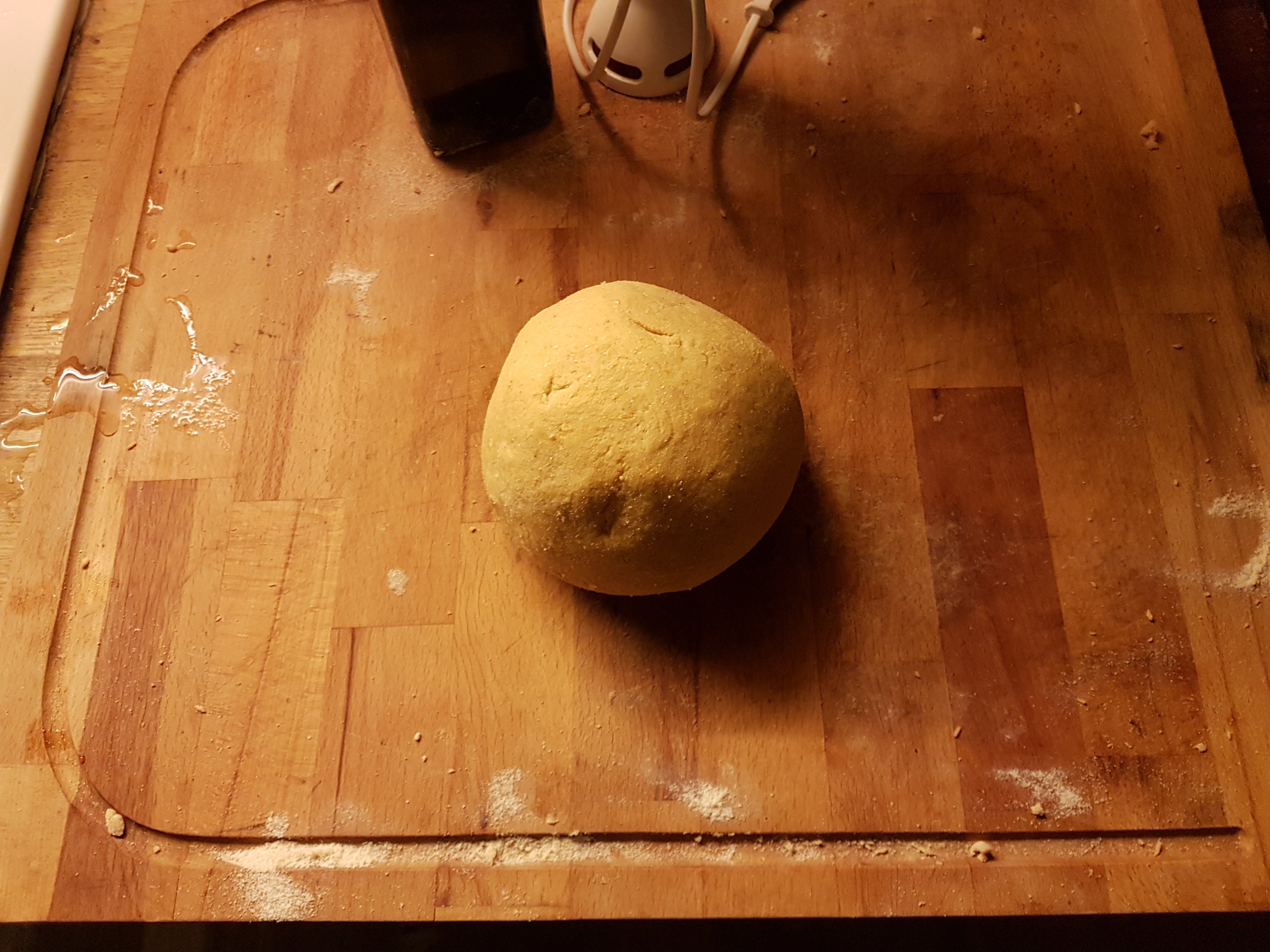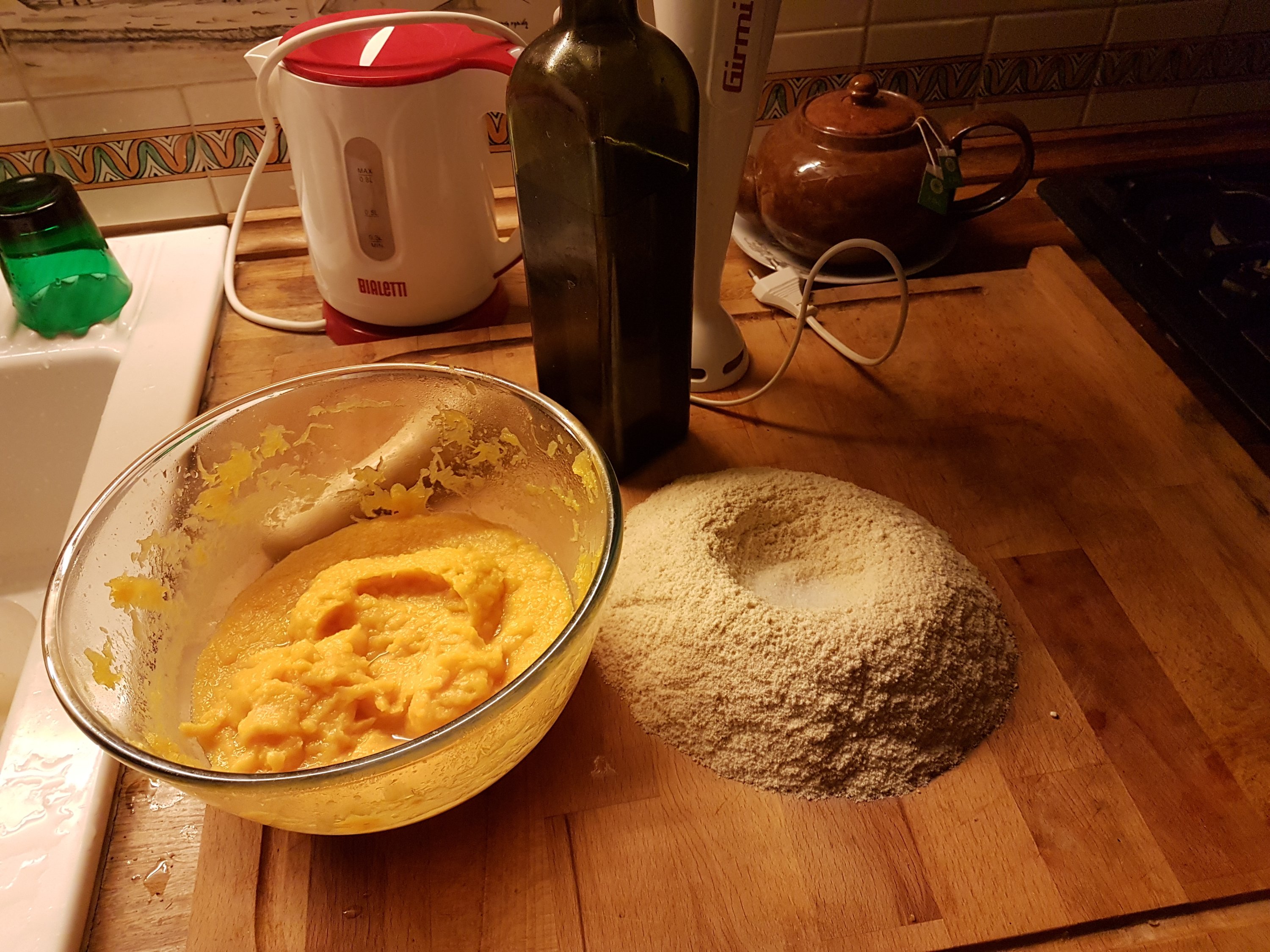 Blend the pumpkin with olive oil you cold extracted last October to form a cream and mix it with flour till become an homogenous dough.