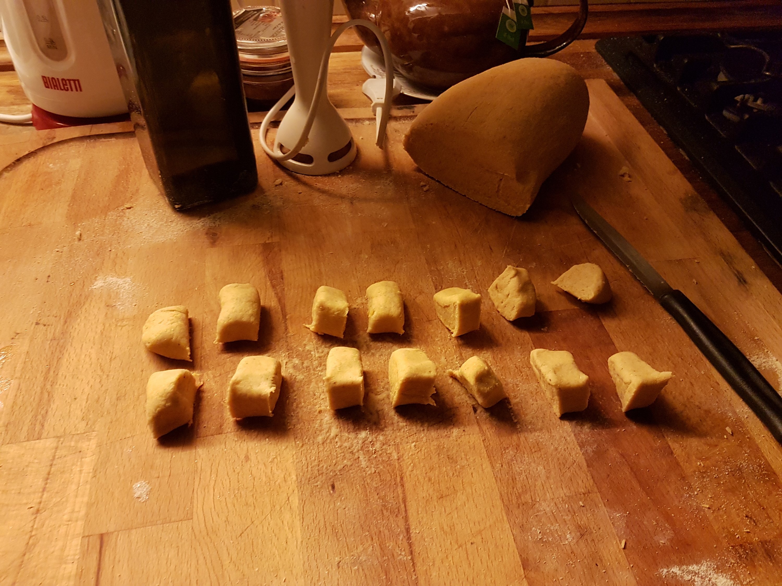 Cut it in large slices and the chop them. Take a fork and roll them down to shape your gnocchi. You are now ready to boil them!