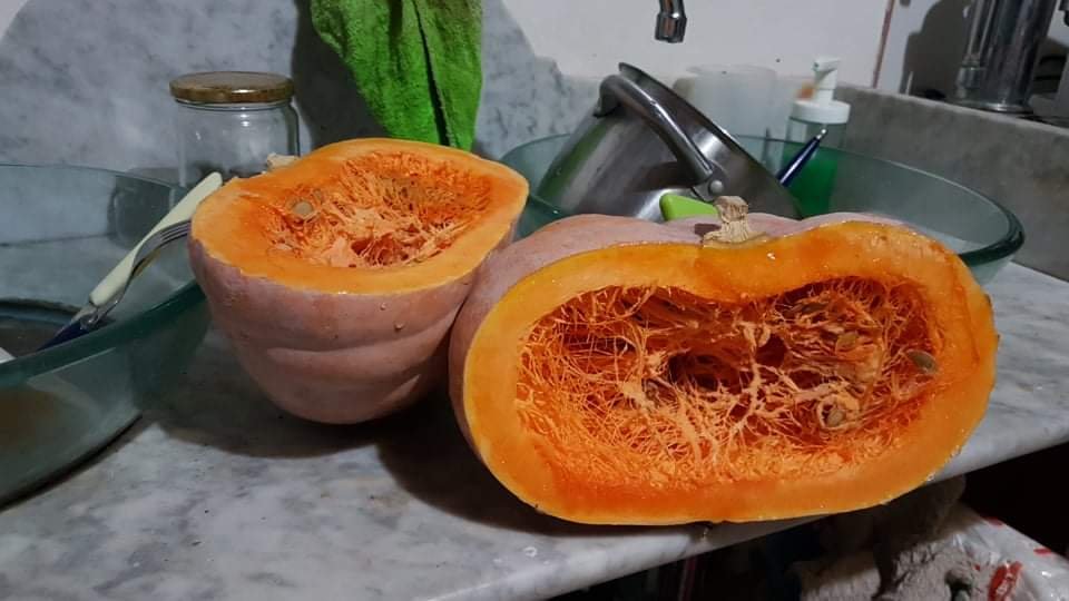 Cut a quarter of the pumpkin you grew in Summer from the seeds collected last year, cut in slices and cool it in the oven for 40 min.